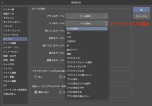③ブラシ系カーソル、ペン系カーソル、消しゴム系カーソルのタブからそれぞれツール固有を選ぶ。